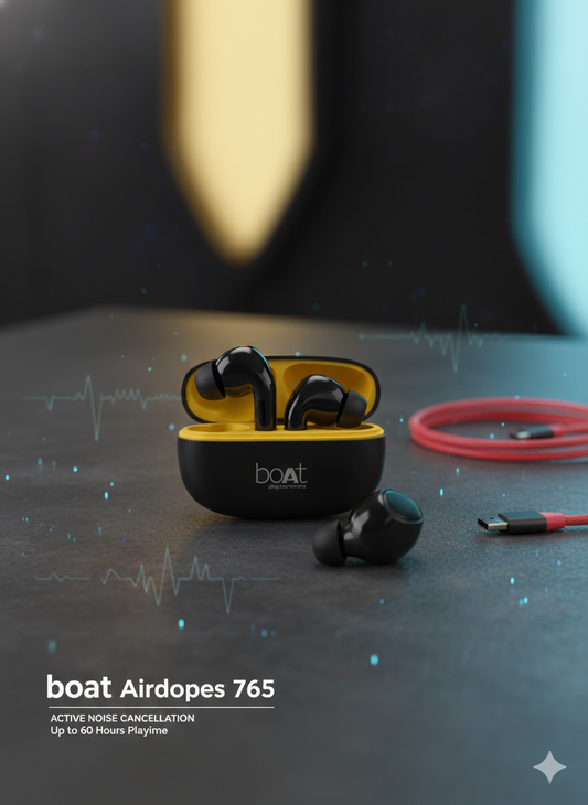 Airdopes 765 ANC: Silence the Noise, Amplify the Style with 60 Hours of Power & Pro-Grade ANC 13mm Drivers and the Dual-Tone design, as that yellow-on-black